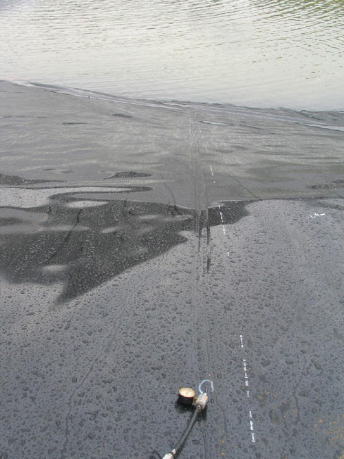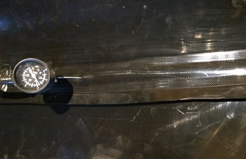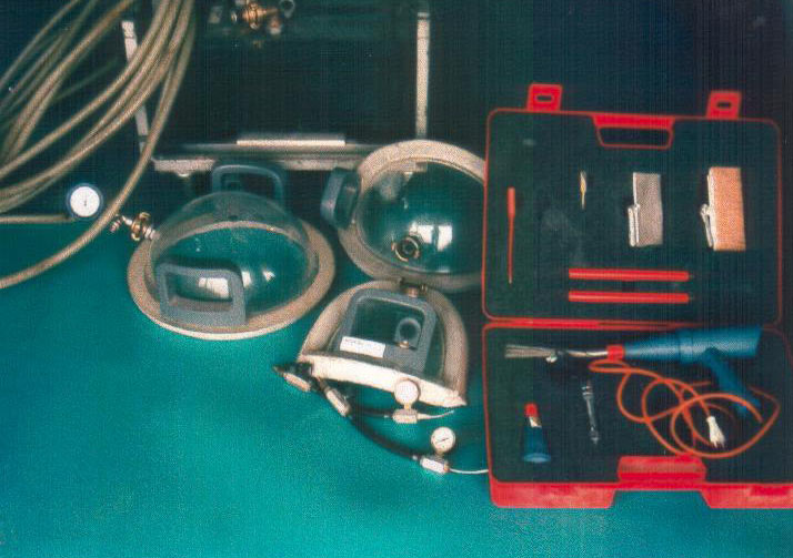 Extrusionsauftragsnähte werden mittels verschieden geformter Vakuumglocken (im Bild links hinten) oder mittels Funkeninduktionsgerät (im Bild rechts, im Koffer) überprüft. Um Doppelnähte zu kontrollieren verwendet man Prüfnadeln (im Bild vorne mitte).