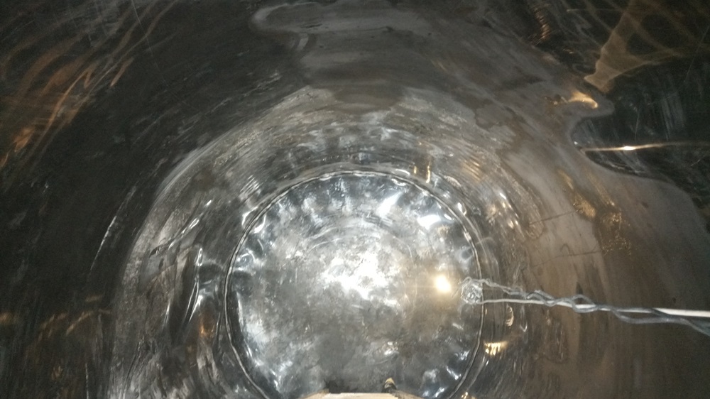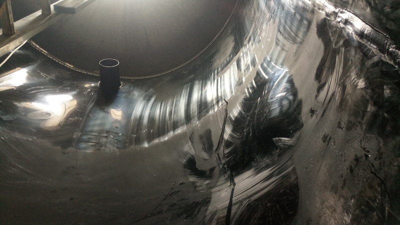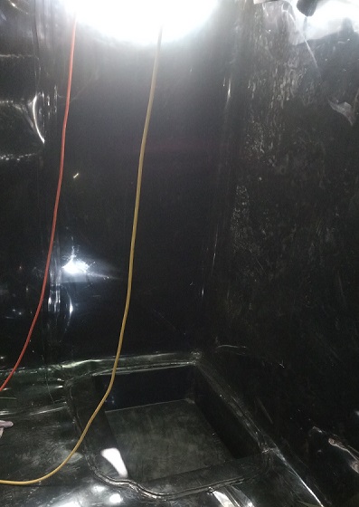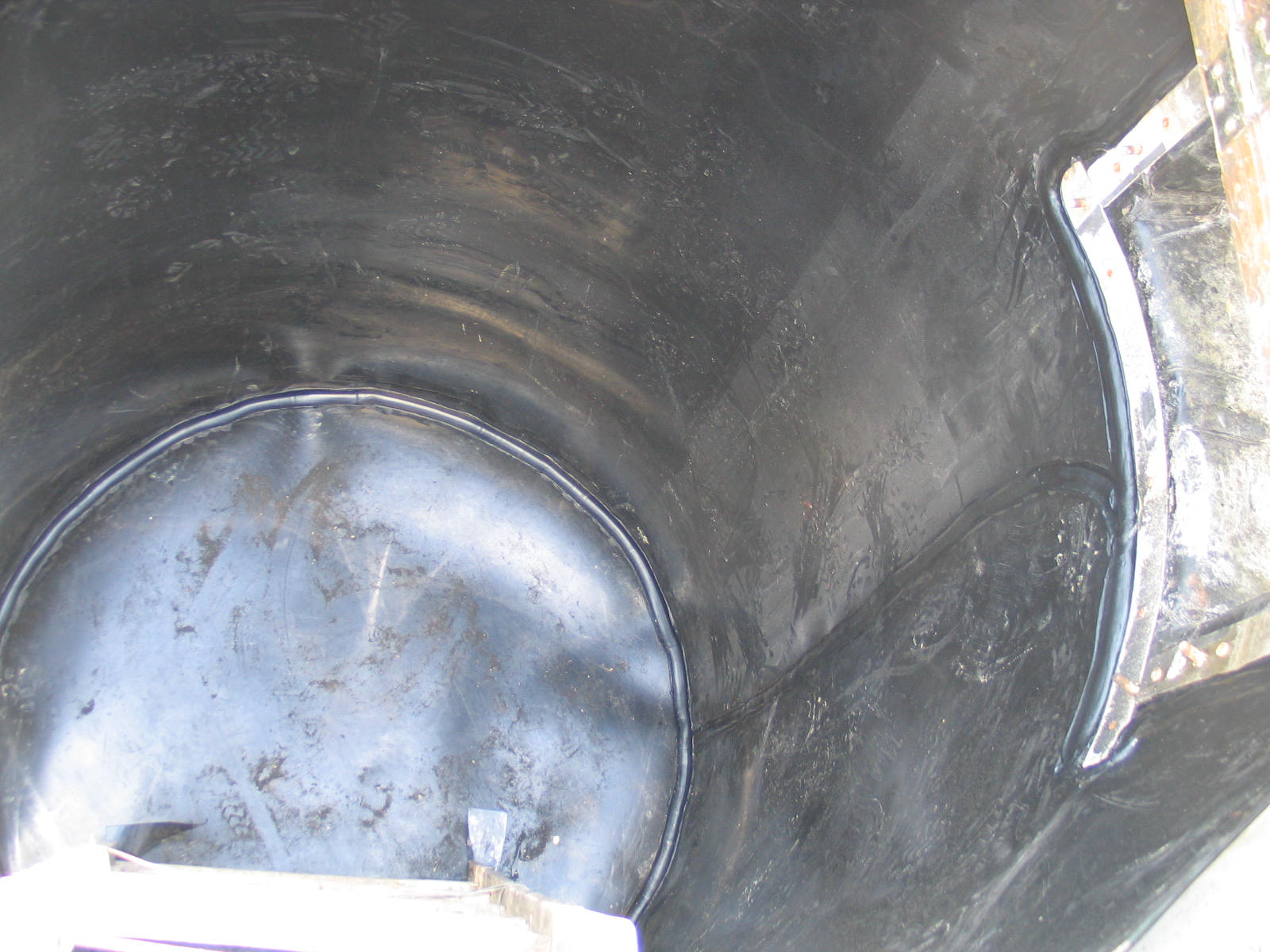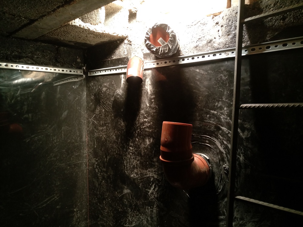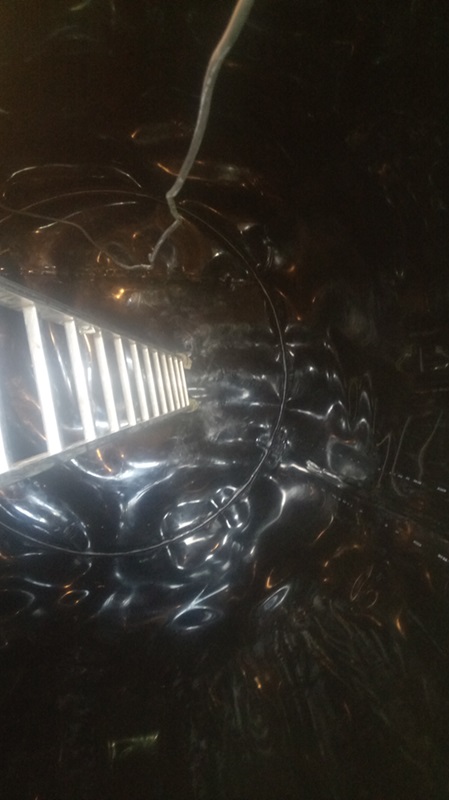 Durch die meist sehr kleinen Einstiegsöffnungen werden die Dichtungsbahnen eingebracht, von innen verschweißt und oben mittels Befestigungsschienen befestigt.