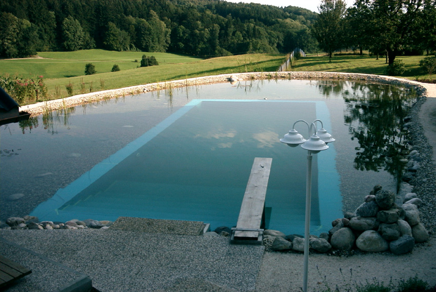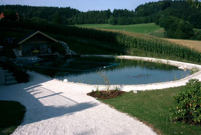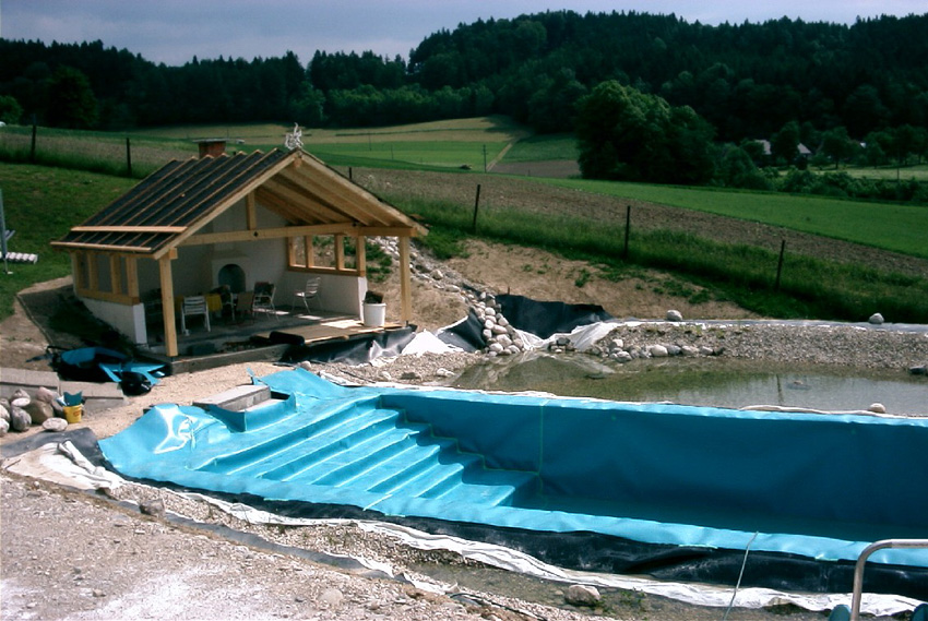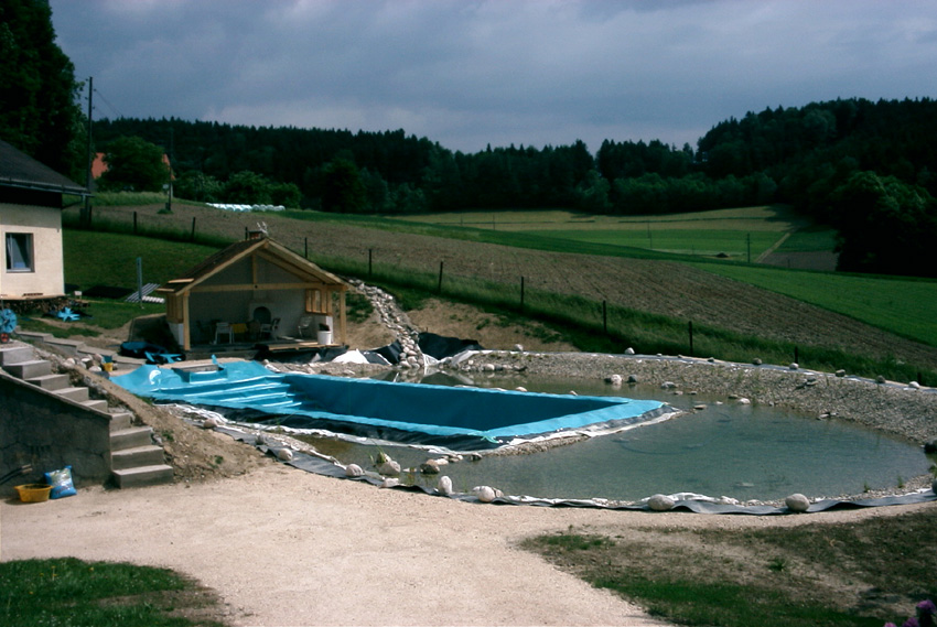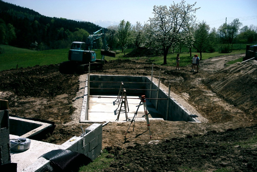Die Bilder zeigen die Entstehung eines Schwimmteiches mit gemauertem Schwimmbereich: