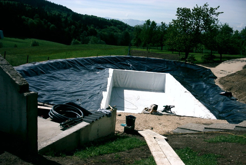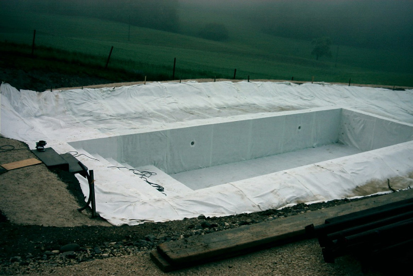 Nach Fertigstellen der Baggerungs- und Maurerarbeiten folgt zuerst die Verlegung und Verschweißung eines Ausgleichsvlieses.